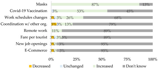 Private boats without permission conducting whale-watching. However, almost half of NGO members mentioned one of the pandemic legacies will be an increase in environmental awareness. Contrastingly, as a COVID-19 legacy, an NGO member mentioned the demand for tours in private boats without permission: “Private fleet offers illegal tours, it will continue, it is a new market niche. Which means an unfair competition, it will normalize in a couple of years,” “Tourism is changing, the priority will be given to experiences that involve fewer people, even if they are at a higher cost” (See Figure 7).