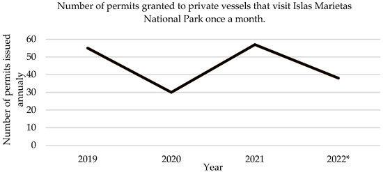The number of permits granted to private vessels that visited Islas Marietas National Park (IMNP) once a month [48]. Before the pandemic, tourist providers asked the national park to regulate private boats; since 2019, one permit per month per private boat has been issued to visit the park. In 2020, due to the pandemic, the IMNP was closed from the end of March to July; thus, the graph shows a short decrease in the number of permits issued, which increased again in 2021. * For the year 2022, data is only available from January to August. This data can be used to approximate the number of private boats conducting whale-watching activities without permission in Bahía de Banderas (source: own elaboration based on unpublished data from National Commission of Protected Areas).