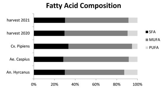 In all cases, the three dominant fatty acids accounting for ~80–85% of the total FA content were the palmitic (24–30%), palmitoleic (29–37%), and oleic (18–29%) acids. These findings resemble the mosquito lipid profile reported by Sushchik et al. [] and Komínková et al. [], where the same fatty acids predominate.