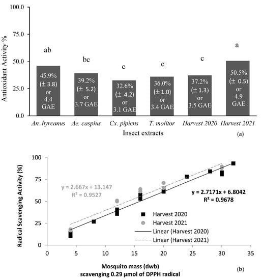 (a) Mean antioxidant activity (expressed as % scavenging activity of the DPPH radical ± SD, and as gallic acid equivalents (GAE)) of methanolic extracts prepared from the mosquito samples examined (Anopheles hyrcanus, Aedes caspius, and Culex pipiens, mixtures of harvest 2020 and harvest 2021). Different letters indicate a significant difference (p < 0.05). (b) Linear dose-dependent capacity of mosquito extracts (prepared from mixtures of harvest 2020 and harvest 2021) to scavenge the DPPH radical.