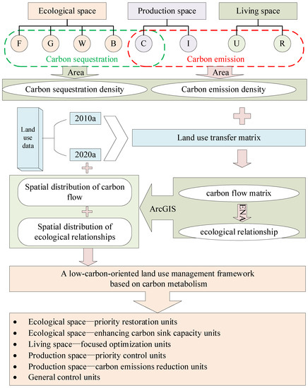 Technical diagram to construct a low-carbon land use management framework. Note: F represents woodland; G represents grassland; W represents water; B represents unused land; C represents cultivated land; I represents industrial, mining and transportation land; U represents urban land; R represents rural residential land.