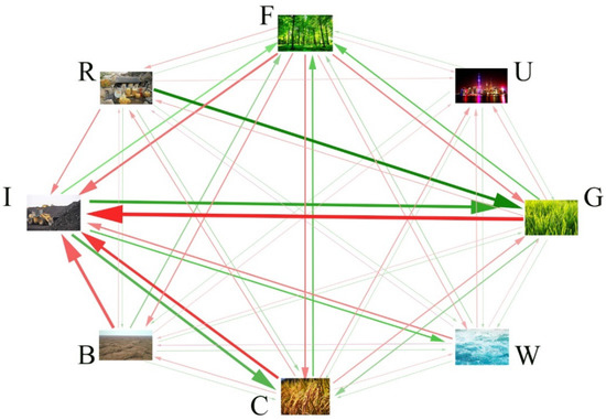 Figure 5 shows the ecological relationships between various land use types in the “ecological-production-living” space in Yulin City under the action of carbon metabolism, including the four relationships: competition, control, exploitation, and mutualism. Among them, control and exploitation are identical in essence although they are presented in opposite ways. Therefore, these two relationships are combined for statistics in the study. The results showed that the number of control and exploitation relationships accounted for 60.72% of the total, and they were widely distributed among the components. Among them, grassland, industrial, mining and transportation land were very important components of the exploitation relationship, both of which accounted for 23.53% of the relationship. It showed that the increase in grassland area and the expansion of industrial, mining and transportation land had important effects on urban carbon metabolism. Competition relationships accounted for 28.57% of all relationships, 75% of which existed in cultivated land and the land of ecological space. This indicated that under the action of the system, there was fierce competition for carbon storage among land use types, including cultivated land and all types of land in ecological space. The reason was that all these land use types have the function of carbon sequestration, and competition between them was inevitable under the premise of limited carbon storage in the system. Mutualism relationships accounted for only 10.71% of all relationships. There were mutualism relationships between grassland and urban land, between grassland and industrial, mining and transportation land, and between urban land and rural land. Under the premise that carbon emission was fixed and there was no obvious land transfer between these two types of land, the carbon emitted by urban land and industrial, mining and transportation land was absorbed by grassland, which promoted the expansion of grassland. At the same time, the enhanced carbon absorption brought about by the expansion of grassland also reduced the pressure on the carbon emission of the system, which was beneficial to the expansion of urban land and industrial and transportation land. For urban land and rural land, although the direct “carbon flow” will not bring about a mutualism relationship, the transfer of these two types of land to other types of land to a certain extent will reduce the carbon emissions of these two types of land relatively. In general, the carbon metabolism system of “ecological-production-living” space in Yulin was dominated by the control and exploitation relationship, and the proportion of mutualism relationships in all relationships was smaller than that of competition relationships. This showed us that the relationship among the components in the carbon metabolism system was relatively conflicted and the reciprocal level of the carbon metabolism system was not high.