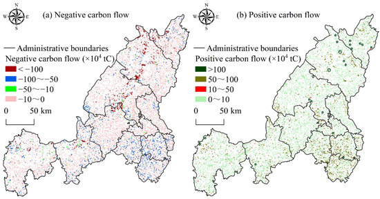 In order to more intuitively display the spatial distribution of net carbon flow in the “ecological-production-living” space of Yulin city from 2010 to 2020, the study finally divided both positive and negative carbon flow into four grades, which achieved the best grading effect, as shown in Figure 4. From 2010 to 2020, the patches without carbon transfer in the horizontal direction of Yulin City accounted for 55.76% of the total area, and the patches with negative carbon flow and positive carbon flow accounted for 23.24% and 21.00%, respectively. Although the area of the plaques with positive and negative carbon flow was not much different, it could be seen from above that the overall net carbon flow was a large negative number, which indicated that the carbon emission intensity of the plaques with negative carbon flow was far greater than that with positive carbon flow. It could be seen from Figure 4a that according to the flow grade from low to high, the area proportions of the plaques with negative carbon flow accounted for 77.76%, 1.40%, 13.75% and 7.09%, respectively. The lowest grade patches with negative carbon flow accounted for the largest proportion, whose carbon flow was mainly caused by the transfer of cultivated land to grassland. In addition, although the plaques with carbon flow higher than 100 × 104 t only accounted for 7.09%, their contribution to the negative carbon flow was 54 times that of other grades of plaques. Moreover, the study found that the spatial distribution of these patches with the highest grade of negative carbon flow was consistent with that of the newly added industrial, mining and transportation land mentioned above, which further highlighted the negative effects of industrial, mining and transportation land on urban carbon metabolism. It could be seen from Figure 4b that according to the flow grade from low to high, the area proportions of the plaques with positive carbon flow accounted for 82.02%, 0.97%, 16.73% and 0.28%, respectively. The lowest grade patches with positive carbon flow accounted for the largest proportion and were widely distributed, whose carbon flow was mainly caused by the transfer of grassland to cultivated land and the transfer of unused land to grassland. In view of the small area, small number, and scattered distribution of patches with the highest grade of positive carbon flow, green circles were added around them for convenient observation. It was found that the plaques with the highest grade of positive carbon flow were mainly distributed in the coal mining areas of Shenmu, Fugu and Yuyang. This was closely related to the fact that the Yulin City government took the Shenmu-Fugu coal distribution area, Yulin-Shenmu coal distribution area and Fugu coal distribution area as key governance areas of the mining environment during the study period, and carried out vegetation restoration and land reclamation for abandoned mines.