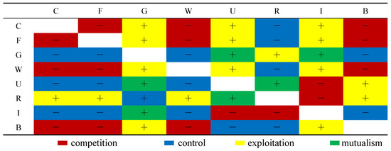 In the matrix U, positive elements represent positive utility, and negative elements represent negative utility. According to the matrix U, the ecological relationship between the two components can be judged. The possible types of ecological relationships are shown in the Supplementary Table S5. Among them, four common ecological relationships are competition, control, exploitation, and mutualism. Control and exploitation relationships indicate that one component benefits from the relationship and the other is harmed. Competitive relationships indicate that two compartments compete with each other and both lose their utility. Mutualism relationships indicate that both compartments increase their utility in the process of interaction.