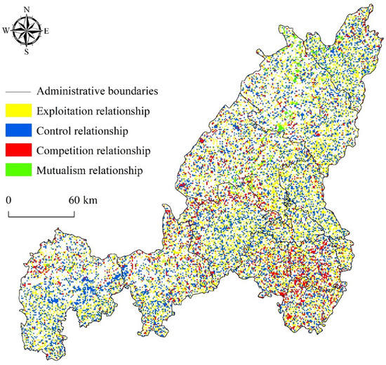 The spatial distribution of ecological relationships is shown in Figure 6. The white area in the figure is the area where the land use type has not changed. It could be seen from the figure that the control and exploitation relationships were widely distributed, mainly in Shenmu, Dingbian and Yuyang, accounting for 30.70%, 30.35% and 28.42% of the relationship, respectively. This is because the area of mutual transfer between cultivated land and grassland, grassland and rural land, forestland and grassland in these areas is relatively large. The competition relationships were mainly distributed in Yuyang, Jingbian and Suide, accounting for 16.11%, 14.15% and 12.00%, respectively. The main reason is that the area of mutual transfer between rural land and cultivated land, and cultivated land and forestland, in these areas is relatively large. In addition, there was also a large transfer area between cultivated land and forest land. The mutualism relationships were mainly concentrated in Shenmu, Fugu and Yuyang, accounting for 45.41%, 21.00% and 16.27%, respectively. The reason for this is that the transfer area between grassland and industrial, and mining and transportation land, in these areas was relatively large. Generally speaking, the distribution of control and exploitation relationships were relatively broad, the distribution of competition relationships were relatively scattered, and the distribution of mutualism relationships were more concentrated.