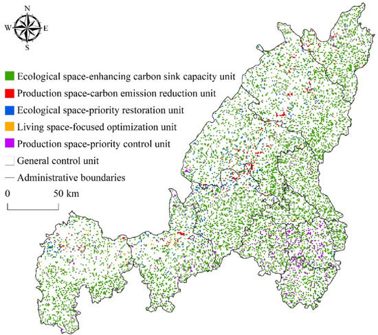According to the dominant factors such as the distribution pattern of carbon flow and its ecological relationships, the status quo of “ecological-production-living” space and so on, a low-carbon land use management framework was proposed. In the paper, an overlay analysis was carried out on the spatial distribution map of Yulin’s “ecological-production-living” space in 2020, and the spatial distribution map of carbon flow and its ecological relationships from 2010 to 2020, and the whole area of Yulin was divided into six types of management and control units (Figure 7).