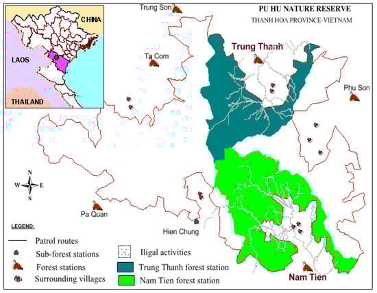 The Pu Hu NR is the largest PA in Thanh Hoa province, Vietnam and it is comprised around 28,000 ha. It was established in 1999 in a mountainous location in the northeast of Vietnam (latitude 20°30′ and 20°40′ N, and longitude 104°40′ and 105°05′ E) (Figure 1). It contains rare and endangered animal and plant species [29]. Since its establishment, this protected area has been managed by forest rangers, who are in charge of law enforcement, and the management of bamboo, roof thatching materials, firewood, medical plants, and cattle grazing, as well as other economic activities, which are prohibited to the local people [30]. There are six main forest stations and one sub-forest station in the Pu Hu NR. The Nam Tien FS and the Trung Thanh FS are close to the towns of Hoi Xuan and Co Luong, respectively. Thus, the potential for illegal activities in the Pu Hu NR is significant because of the ease of transportation and local knowledge.