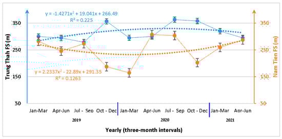 An immensely difficult part of field patrolling is the number of relative altitudes because this essential aspect affects how patrolling rangers account for their patrol timing. The average altitude reached by the rangers from the Trung Thanh FS (347.14 ± 161.41) was noticeably around 1.7-times higher than that reached by the patrollers from the Nam Tien FS (200.85 ± 128.44). In particular, the trend of the relative altitude reached by the Trung Thanh FS rangers increased slightly, while it decreased for the Nam Tien FS rangers (Figure 3). A comparison of the relative altitudes reached by the patrollers from both forest stations across the studied months indicated significant differences in patrolling in the field (U = 79.761, p < 0.05).