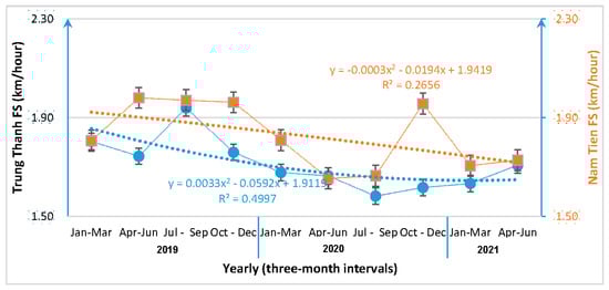 It was noted that the patrolling speeds achieved by the rangers from both forest stations sharply declined from 2019 to 2021 (Figure 4). At the beginning (2019), the average patrolling speeds were 2.0 km/h for the Nam Tien FS and around 1.8 km/h for the Trung Thanh FS. However, the final patrolling speed (from 2021) for the Nam Tien and Trung Thanh FSs was around 1.7 km/h. The average patrolling speed (km/hour) by the rangers from the Trung Thanh FS (1.67 ± 0.35) was lower compared to the equivalent for the Nam Tien FS (1.87 ± 0.50). There was a significant difference in the patrolling speed of the rangers from each forest station (U = 105.462, p < 0.05). The relative altitude was found to correlate markedly with the patrolling speed (rs = −0.21, p < 0.05).