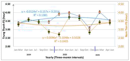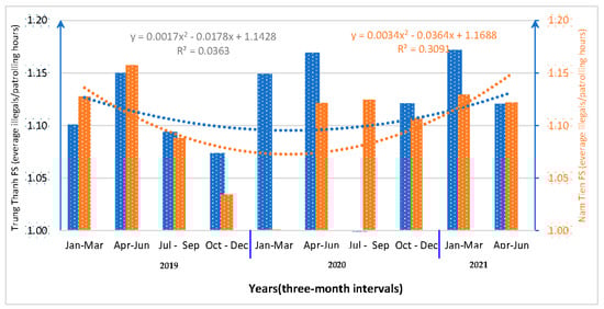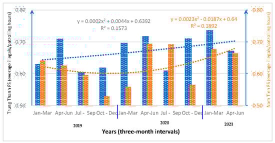 The rate of illegal encounters during patrolling hours was significantly different, and this was important for the rangers in devising a patrolling plan for each track. The average rate of illegal encounters during patrolling hours was 0.70 ± 0.29 illegal encounters/hour for the Trung Thanh FS and 0.61 ± 0.33 illegal encounters/hour for the Nam Tien FS. Even at the beginning of the two-year period, the rate was around 0.65 illegal encounters/hour for both forest stations. There was an increase of 0.7 illegal encounters/hour for the Trung Thanh FS and 0.68 illegal encounters/hour for the Nam Tien FS (Figure 9). The ratio of illegal encounters to patrolling hours for the Trung Thanh rangers was higher and increased constantly during the research period. There was a significant difference in the ratio of illegal encounters to patrolling hours between the Trung Thanh and Nam Tien FSs (U = 123.245, p < 0.05).