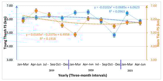 Regarding the patrolling performance and conservation requirements, the distance walked during field operations was the most important indicator of law enforcement efforts that was considered by the management board and the rangers. These figures indicate how far and large the range can be in the forest areas, with each ranger responsible for a permanent forest plot. The average distance walked by the patrollers from the Trung Thanh FS was 6.39 ± 4.11 km, while the figure was 5.64 ± 2.82 km for those from the Nam Tien FS. The average distance walked by the patrollers from both forest stations dropped from around 6.2 km in 2019 to 5.8 km in 2021 (Figure 6). Furthermore, the distance walked by those from the Trung Thanh FS was significantly different from the equivalent figure for the Nam Tien FS (U = 166.965, p < 0.05).