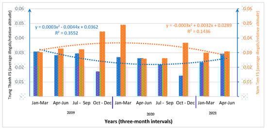 The management board and rangers found it impossible to anticipate the number of illegal encounters because so many were occurring in the field. The patrolling plans designed from the lessons learned could be based on the ratio of encounters to the patrolling field. Interestingly, the proportion of illegal encounters to the relative altitude patrolled slowly decreased for both forest stations during the 26-month period. The ratio at the start (2019) was over 0.03 illegal encounters, and this had fallen by 2021. The average ratio of illegal encounters to the relative altitude in 2020 was the highest in the Nam Tien FS area (Figure 7). Similarly, the average ratio of illegal encounters to the relative altitude of the patrolling tracks was 0.01 ± 0.75 and 0.03 ± 0.47 for the Trung Thanh FS and Nam Tien FS, respectively. The ratio of illegal encounters did not vary (U = 167.815, p > 0.05) between the Trung Thanh and Nam Tien FSs. Meanwhile, the ratio of illegal encounters to the relative altitude was significantly different between the Trung Thanh and Nam Tien FSs (U = 127.239, p < 0.05).
