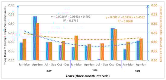 The average patrolling speeds of the rangers were 0.38 ± 0.35 km/h at the Trung Thanh FS and 0.44 ± 0.32 km/h at the Nam Tien FS during the patrolling period. More importantly, the ratio of illegal encounters to the patrolling speed for both forest stations was around 0.45, and this slightly decreased during the two-year period. However, the ratio of illegal encounters to the patrolling speed for the Nam Tien FS was higher than the equivalent for the Trung Thanh FS. Surprisingly, this ratio was the lowest from June to September of 2020, with almost no illegal encounters in Trung Thanh. There was a significant difference in the proportion of illegal encounters to the patrolling speed between the forest stations (U = 167.815, p > 0.05) (Figure 8).