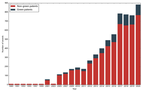 The steps for collecting the award-winning patent dataset are as follows. First, by visiting the website of the CNIPA (https://www.cnipa.gov.cn/col/col41/index.html (accessed on 1 July 2022)), collecting and sorting out all the award-winning information of the patent invention applications, and standardizing the processing of the dataset, we obtain the number of all the award-winning patents which is 6169. Then, restricting our analysis to those patents that were issued within our dataset’s temporal span, and matching the green patents in the CNGP applicant citation dataset, and the number of the green patents is 839 in the end. From 1989 to 2020, there are a total of 22 sessions of the Chinese Patent Award. The number of green patents awarded in the CPA by session is shown in Figure 2. Before 2007, this award was held biennially, and after that, it was held annually. Figure 2 shows that the number of invention patents awarded is not fixed in each session, but the number of awards for green patents has increased obviously since 2015. It can be seen that to achieve sustainable development, the research of green patents has gradually received attention from society and the government.