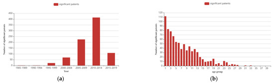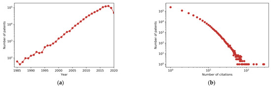 - Since the CNIPA database does not include patents’ citation information. Google Patent (https://patents.google.com/ (accessed on 1 July 2022)), fortunately, provides related citation data for all Chinese patent applications. Moreover, Google Patent updates the forward citation data of each patent according to the information on the backward citation. We link those data with the CNGP dataset through the patent’s publication number [45,46].