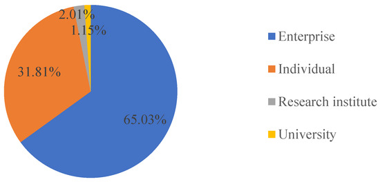 We divided the applicant for patents into four types: enterprise, university, research institute, and individual. Figure 4 shows the proportion of different applicant types in our dataset, it illustrates that enterprises constitute 65.03% of the Chinese green patent applicants and are the largest component. The second-largest component is individuals, which account for 31.82% of applicants. Meanwhile, research institutes and universities constitute 2.01% and 1.15% of applicants, respectively. These findings show that in Chinese green patents, enterprises are dominant, followed by individuals, while research institutes and universities’ participation is relatively small. The high proportion of enterprises and individuals illustrates that they are more inclined to transfer technological innovation into patents and could benefit from their own patents, such as by enhancing their core competitiveness. On the contrary, the proportion of research institutes and universities is smaller, because the number of them is limited, but their R&D capabilities cannot be ignored, so the analysis of applicants is particularly indispensable.
