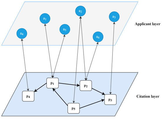 As can be seen from Figure 5, the heterogeneous applicant-citation network structure consists of two layers, the applicant layer and the citation layer. The applicant layer includes all applicants in the dataset, the citation layer is the patents’ citation network, where node denotes patent and edge denotes citation relationship. Linking applicant layer and citation layer by patent’s application number. There are no edges between applicants, which differs from other paper/author networks such as the one proposed by Zhou et al. [57], Sun et al. [58], and West et al. [59]. As the links between applicants may make applicant social networks dominate the ranking system, in our study the ranking should be directed mainly by patents, rather than applicants’ information. Therefore, we exclude the links between co-applicants in the applicant layer, and the undirected link of the applicant-patent is represented by a bidirectional link as Figure 5 shown. We treat the applicant-patent link as a citation link and use the citation-based ranking metrics to analyze the significance of patents on this network.