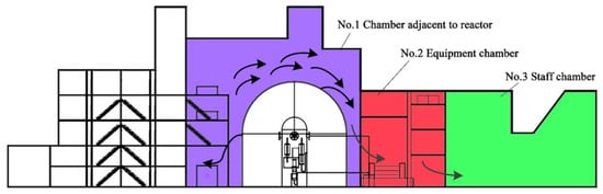 Based on the results shown in Figure 2, the effective dose to which personnel were exposed exceeded the 500 mSv limit after 60 s of the LOCA. Therefore, emergency response measures, such as keeping the chambers closed and preventing spreading to the cabin, are proposed after the marine reactor LOCA. An emergency response measure that activates the emergency exhaust system of the reactor’s cabin is proposed to reduce the level of radioactivity.