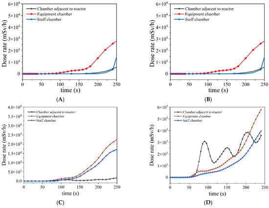 In a previous study, many radionuclides were released from the core after a LOCA occurred in the primary circuit of the marine reactor. Most of the radionuclides were concentrated in the cabin area. Thus, monitoring of the source term [] released was regarded as a secondary index of emergency response measures for the marine reactor LOCA. The variation trend in the amounts of alkaline earth released in the primary circuit during the accident is shown in Figure 4. The radiation dose rate increased rapidly due to the accumulation of radionuclides in different areas, thereby increasing the radiation hazard to workers.