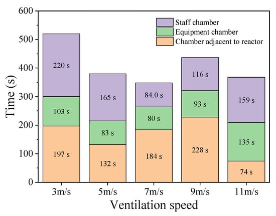 Under different ventilation speeds, the distribution of radionuclides accumulating radiation dose rates exceeding the limit value in different areas is not a linear trend. When the ventilation speeds were 5 and 11 m/s, the safe evacuation times for the chamber adjacent to the reactor were 132 and 74 s, respectively, shorter than those at other ventilation speeds because the chamber adjacent to the reactor was closest to the containment. When the ventilation speed was low, the radionuclides were mainly diffused through gravity sedimentation. When the ventilation speed was increased, the radionuclides encountered the wall with acute airflow diffusion in the chamber adjacent to the reactor, thereby forming vortices. The longer they stayed in the chamber adjacent to the reactor, the shorter the evacuation time.