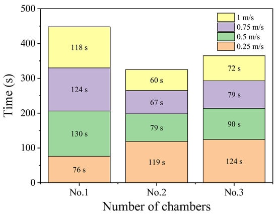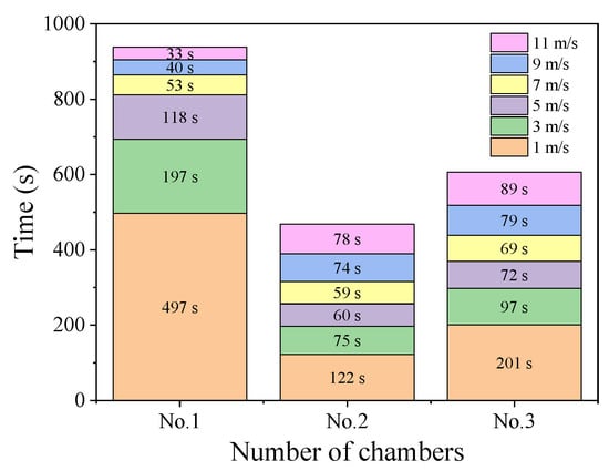 Figure 3 shows the evacuation times in the chamber adjacent to the reactor, equipment chamber, and staff chamber under different ventilation speeds. When the ventilation speed was low, the more time the radiation dose rate accumulated in different areas and exceeded the dose rate limit. The longest evacuation time in the chamber adjacent to the reactor was 228 s at a ventilation speed of 9 m/s, whereas the shortest evacuation time was 74 s at a ventilation speed of 11 m/s. Therefore, if staff are in the chamber adjacent to the reactor when a marine reactor LOCA occurs, the best emergency response measure would be to set the ventilation speed within the range of 7 to 9 m/s to provide sufficient time for safe evacuation. The longest evacuation time in the equipment chamber was 135 s at a ventilation speed of 11 m/s, whereas the shortest evacuation time was 80 s at a ventilation speed of 7 m/s. Hence, if personnel are in the equipment chamber when a marine reactor LOCA occurs, a ventilation speed of 11 m/s would be the best emergency response measure. The longest evacuation time in the staff chamber was 220 s at a ventilation speed of 3 m/s, whereas the shortest evacuation time was 84 s at a ventilation speed of 7 m/s. Therefore, if workers are in the staff chamber when the marine reactor LOCA occurs, the best emergency response measure would be to set the ventilation speed in the range of 3 to 5 m/s to provide sufficient time to evacuate safely.