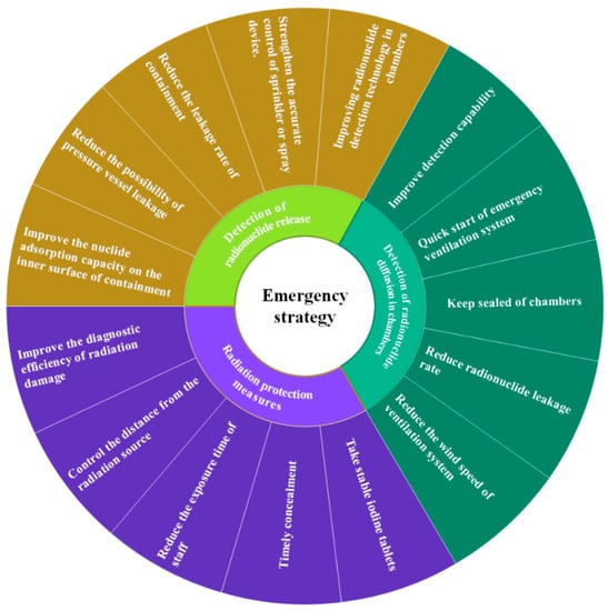 (2) The tertiary indicators for emergency response measures were formulated to reduce the exposure dose to staff and prolong the principle emergency operation time. AHP was used to determine the weights of all the indicators. In the emergency response measures for the monitoring of the source term released, the weight of improving radionuclide detection technology in the chambers was the highest, and the value was equal to 0.4442. By calculating the emergency response measures for the monitoring of radionuclide diffusion in a closed environment, the weight of improving detection capability was 0.4382, accounting for the maximum proportion. We calculated the emergency response measures in radiation protection measures. The weight of improving the diagnosis efficiency of radiation damage was 0.4524, accounting for the maximum proportion. Therefore, the three proposed strategies are the most important among the tertiary emergency response measure indicators. It is important to analyze and implement these three emergency measures to reduce the radiation consequences of nuclear accidents.