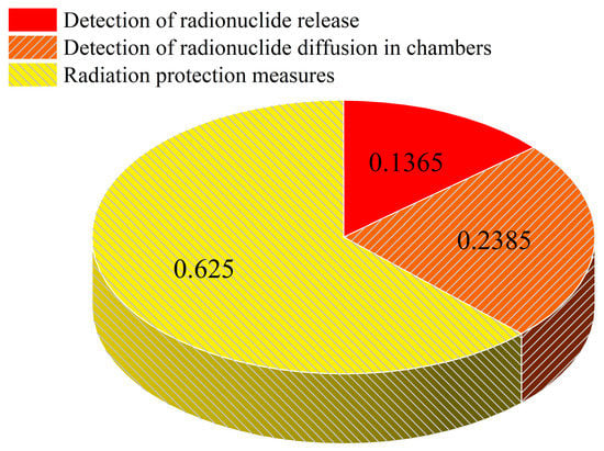 As shown in Figure 9, the index of the radiation protection measures had the maximum weight, followed by the monitoring of radionuclide diffusion in closed environments. Figure 9 shows the weights of the third-level indices established under the corresponding second-level indices.