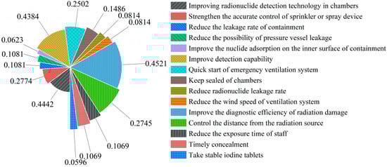 Since CR was <0.1, the judgment matrix should be considered reasonable. Therefore, the weight of the secondary index for the emergency response measures based on radiation consequences was calculated, as shown in Figure 8.