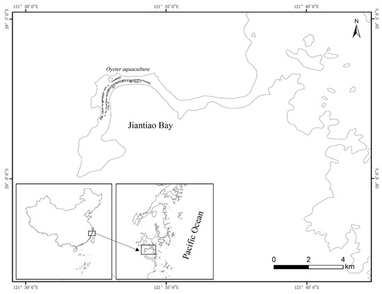The study was carried out in Jiantiao Bay, which was located in the eastern Zhejiang Province, China (Figure 1). The bay is long, narrow, curved and is a suitable habitat for oysters. The oyster aquaculture is an important local industry in the bay and the aquaculture area has reached about 1.8 km2. Two species of oysters (Crassostrea hongkongensis and Crassostrea sikamea) are farmed commercially in the bay. Raft oyster aquaculture (ROA) and long-line oyster aquaculture (LLOA) are the main oyster aquaculture methods in the bay.