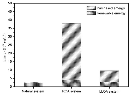 The variation observed in the renewable emergy inputs was mainly due to the different amounts of POM that were needed, as the oysters were farmed at different densities in the ROA and LLOA systems. The ROA system had higher renewable emergy inputs, as the oysters in the system were more intensive and more POM resource was filtered. However, compared with the purchased emergy, the variation in renewable emergy inputs in both aquaculture systems was less conspicuous. The purchased emergy accounted for 89.39% and 69.93% of the total emergy in the ROA system and LLOA system, respectively, meaning both oyster aquaculture systems were highly dependent on external resources.