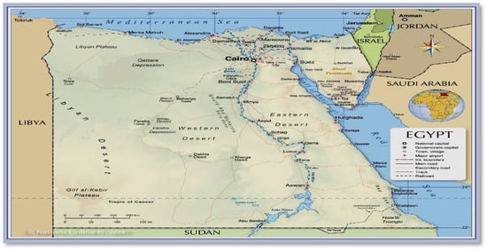The project to reclaim the 20,000 acres in western Upper Egypt is one of the significant agricultural projects. The West Minya project is a pilot research farm that includes farms for animal production and greenhouses, located within an area of more than 420,000 acres [38,39]. The Egyptian state has developed an agricultural strategy that is compatible in its objectives with the sustainable development goals, as it aims to enhance food security, improve nutrition in a healthy and safe manner, meanwhile promoting sustainable agriculture, eliminating poverty in rural areas in Upper Egypt, improving the standard of living and increasing the competitiveness of agricultural exports [40,41]. The development of Upper Egypt faced great challenges, but the will of the State stood in front of them, and plans were drawn up to develop the governorates of Upper Egypt in a comprehensive manner that guarantees the citizen a “Hayat Karima i.e.: Dignified Life”. Despite all of these challenges, cultivation of plants still depends on flood irrigation that consumes huge amounts of fresh water. The New Upper Egypt project focused on re-using pure treated wastewater in the shredder, as there is no agricultural wastewater system in Upper Egypt to dilute its pollutant. Both high salinity and heavy metal precipitation are the negative drawbacks on the farmer’s health and safety.