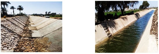 Successive Egyptian governments have worked on preparing water strategies, policies, and national plans, which would contribute to achieving the maximum benefit from Egypt’s river water. At the beginning of 1998, the first integrated strategy for Egypt’s water policy was drawn up, based on its implementation on the theory of “integrated management of water resources” [9], with the participation of various ministries and authorities. The cost of the strategy’s [10] projects, with its various axes, amounted to £145 billion GBP. Egypt continued to implement it until 2017. The strategy is divided into three main axes: (a) maximizing the use of every drop of water, (b) eliminating pollution and confronting its problem and (c) cooperating with the countries of the Nile River Basin to preserve and develop it. The major strategy included two main axes: (1) the first axis is concerned with what we might call the pursuit of good use of water resources, through the theory of integrated water-food resource management, which takes into account all the available and required resources to meet all uses and strike a balance between them through the adoption of a number of targeted policies that maximize the benefit of the water unit [10]. (2) the second axis is to offer foreign alternatives, aimed at cooperating with the Nile Basin countries in order to develop their water resources and their proper exploitation, on the one hand, and the implementation of Upper Nile projects with the purpose of increasing river drainage and reducing losses for the basin countries benefit, on the other hand. At the end of 2020, Egypt launched a strategy for water resources management until 2050, within the axes of the National Water Resources Plan, at a cost of 50 B$, called “4T”, with the participation of a number of ministries [11,12,13]. Among the most important projects that the ministry is currently implementing within the framework of this plan are the national project for rehabilitation and canals lining, as shown in Figure 2; the project of transformation from flood irrigation (FI) systems to drip irrigation (DI) systems; programs for adaptation to climate changes; protection from sea level rise; and rain harvesting projects [14,15,16,17,18,19,20]. This plan pays special attention to the middle years 2022 and 2030, for several reasons, including that Egypt has prepared a strategy of sustainable development goals (SDGs) for the country until 2030, with the aim of placing Egypt among the top 30 countries in the world, economically and socially, by 2030. In addition, the plan takes into account the objectives of the sustainable development strategy in Egypt [18].