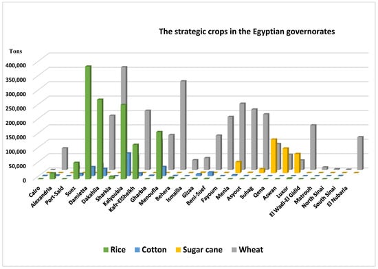Although Egypt has the necessary ingredients for the cultivation of all crop kinds, the annual population increase and Egypt’s shared stability in the Nile River has led to a shortfall in the quantities of crop production and in the ability to meet their needs. A large gap between production and consumption led to dependence on imports, which constitutes a financial burden on the economy. Maximizing the use of water resources and switching to modern agricultural methods is a necessity to maintain the country’s food and water security. Data were collected from the Central Agency for Public Mobilization and Statistics to realistically assess the current situation; Table 3 presents the strategic crops in the Egyptian governorates [34].