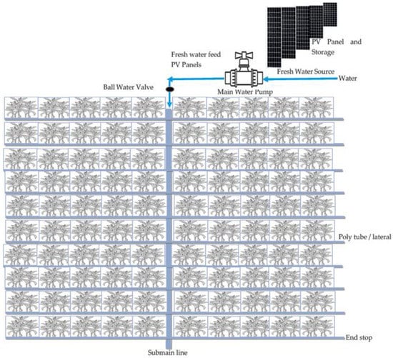 The changes we need for modern agriculture are proposed in Figure 5. We suggest using PV panels and storage as a clean energy source, used to collect and store energy needed to run and operate the pump for the drip irrigation systems [42,43]. Drip irrigation systems are mainly selected to enhance and improve the use of available water resources in order to optimize crop productivity [44]. Most drip irrigation systems are also known as poly micro plastics tube irrigation, designed as horizontal lateral lines which supply fresh water, either onto plant surfaces directly to the root zone or onto the soil surface, through low pressurized tube lines, solenoid valves and drippers, to make water flow slowly. It is known that drip irrigation conserves around 40–70% of fresh water compared to conventional flood irrigation systems. Drip irrigation conserves a large amount of fresh water, from the start feed preparation levels to the last step of plant harvesting. The paddy (a common type of rice) shows that around 1.3 M/L of fresh water is required for feeding an acre of paddy under conventional flood irrigation system; in addition, the drip irrigation system uses only about 0.4 M/L of fresh water [45]. It has become possible by using DI that all growing vegetables and crops can be cultivated by the least amount of fresh water.