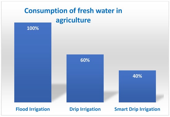 Telematics—online positioning technologies using hardware and software —are the core data used for the smart drip irrigation application, that is the mind and hands of farmers. Undoubtedly, the improvements made by smart drip techniques will be positively reflected in the income of the farmer and the economy of the country, but only if all the techniques are implemented in a proper way [52,53]. Finally, the data analytics solution is the controller used to adapt the drip irrigation process in cultivation, in order to reach the efficient use of fresh water in the cultivation of strategic crops [54]. According to the data from the Egyptian general authority for mobilization and statistics, the amount of fresh water used in agriculture has decreased by 40% while using drip irrigation, whereas this percentage can be reduced by 55–60% through the implementation of smart drip irrigation, as explained in the above paragraph, and shown in Figure 7.