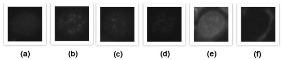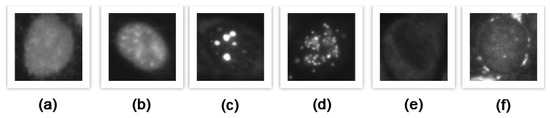 Sample cells from positive dataset [27]: (a) homogeneous, (b) speckled, (c) nucleolar, (d) centromere, (e) nuclear membrane, and (f) Golgi.
