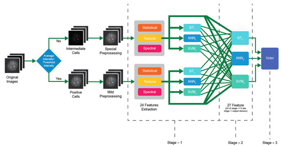 ANN was also an appropriate classifier for the HEp-2 cell categorization problem. The HEp-2 cell classification problem is considered a complex classification problem because the intraclass variations are more. ANN can handle such issues by adjusting the weights by the more sophisticated algorithms like scaled conjugate gradient back propagation (SCGBP) during the training process. SVM was considered as a suitable classifier [28]. The BT, ANN, and SVM were base classifiers. In the proposed Multistage Classification Scheme (MSCS), BT1, ANN1, and SVM1 were trained individually with only 24 On the image training datasets in the first stage as base learners. In the second stage, the feature set was augmented to 27 elements with the first stage prediction results again meta learners BT2, ANN2, and SVM2 were trained for this augmented feature set to achieve better accuracy. Both intermediate as well as positive cells feature set are combined to produce a prediction class. The first stage prediction results had significantly less intraclass variance and good inter-class variance. Thus, the performance of classification increases in the second stage of the classification. In the third stage, the results of the BT2, ANN2, and SVM2 were combined using majority voter logic to produce a predicted class. The majority voter logic was appropriate, as the instances with different prediction results from the three classifiers were lower. To validate the efficiency of the proposed architecture, the leave-one-specimen-out validation scheme has been modified.