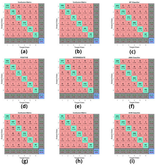 Confusion matrix results of Stage 1: (a) Intermediate , (b) positive , (c) intermediate and positive combined , (d) intermediate , (e) positive , (f) intermediate and positive combined , (g) intermediate , (h) positive , and (i) intermediate and positive combined .