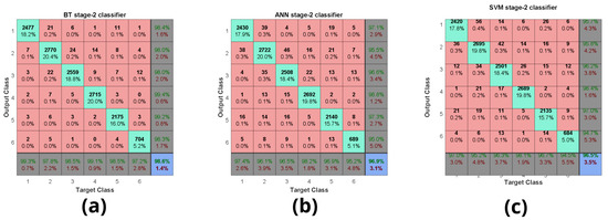 In Stage 2, the Meta learners BT2, ANN2, and SVM2 were trained for an augmented feature set (24 + 3 results from base learners). The base learners’ predicted results had significantly less intraclass variance and more inter-class variance, making a good feature for the classification. Therefore, the performance of , , and was increased by 1.8%, 4.5%, and 4.1% as compared to Stage 1, as shown in Figure 6.