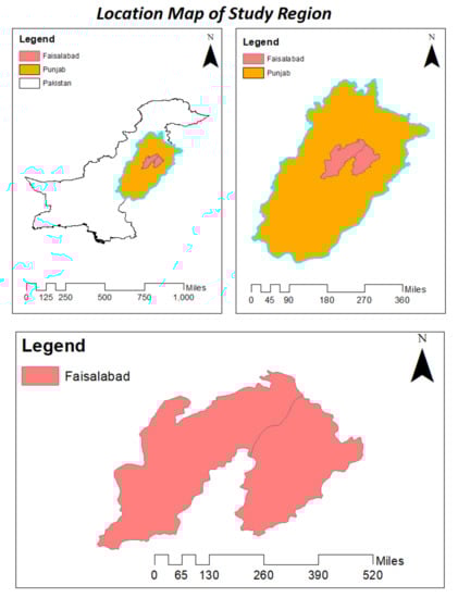 Six wheat cultivars were sown in Faisalabad, Pakistan at two different locations: University of Agriculture Faisalabad (UAF), and Plant Pathology Research Institute (PPRI), Faisalabad (Figure 1), Pakistan during three growing seasons, viz. 2016–2017, 2017–2018 and 2018–2019. Another research trial was conducted at the third location i.e., Wheat Research Institute (WRI), Ayub Agriculture Research Station-Faisalabad, during the crop season 2018–2019 and 2019–2020 to validate disease prediction models for estimating leaf rust severity percentage and related yield losses (Table 1).