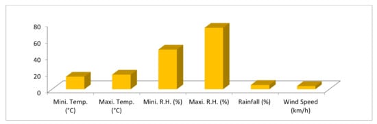 The predictive disease model based on total rainfall and minimum air temperature from March to May at Holy Springs fit the data well. Similarly, Khan [] studied fifteen wheat cultivars for partial resistance with respect to epidemiological variables. Various cultivars indicated partial resistance. The epidemiological variables, i.e., minimum and maximum temperature, and relative humidity were in the ranges of 16–18 °C, 22–28 °C, and 77–78%, respectively. A linear regression model best explained the relationship between partial resistance and different epidemiological variables.