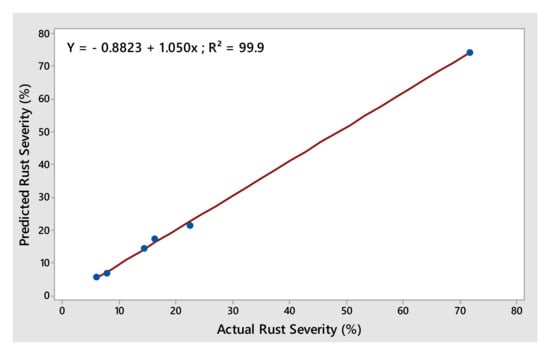 Relationship between predicted and observed leaf rust severity (%) as predicted by disease predictive models for tested wheat cultivars.