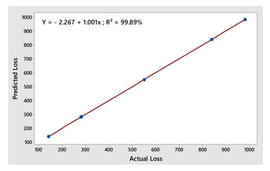 The six models developed for the prediction of leaf rust severity and yield loss (%) were validated by forecasting the leaf rust severity and yield loss (%) and comparing the results with the actual values of these parameters as observed at Wheat Research Institute (WRI), Faisalabad during the 2018–2019 and 2019–2020 growing seasons (Table 8 and Table 9 and Figure 3 and Figure 4). The disease predictive leaf rust severity and yield loss (%) models were close to the actual leaf rust severity and yield loss (%) for each genotype. These disease predictive models were therefore considered accurate to predict leaf rust severity and yield loss (%). The coefficient of determination value of association between actual and predicted leaf rust severity and yield loss (%) was greater than 0.99. Thus, the predictive models proposed in this study are highly accurate, having a prediction capacity of 99%.