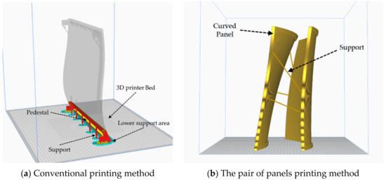 Accordingly, in order to remove these unproductive factors caused by additional supports, a method for minimizing support by removing the overhang features [16,19] and changing the shape [15] or angle [17,18,20,21] of the overhang has been discussed. However, such methods are not suitable for printing curved panels based on a design document that must be produced with minimal manufacturing errors. In addition, the slicing programs and printing software of existing 3D printers are aimed at optimizing the printing of a single target. These are types of software that determine the direction or support installation according to the printing shape, and there is no function to print multiple objects in a bundle or to divide objects [16,20]. For these reasons, a method of printing a pair of panels supporting each other with minimal support has emerged, which has proven to be highly efficient for manufacturing curved panels [22].