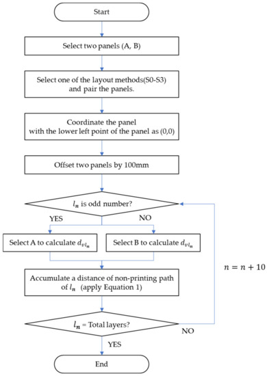 The non-printing movement path of the two panels differed depending on the panel type and layout method. The shape of the panel differed depending on the type of panel, and it was determined by how the two panels were selected. There were a total of four ways to layout the panel: a basic panel, a panel rotated left and right by 180°, a panel rotated up and down by 180°, and a panel rotated both up and down and left and right (Figure 3). As a result, the non-printing movement path was determined by how the two panels were selected and laid out using one of the four methods. Because the number of cases of panel selection and the number of printing layers were great, an optimization model was required for the calculation.