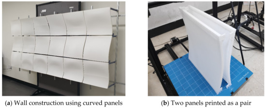 Through the results of this study, some panels of the case study were printed as a test (Figure 8a). Figure 8b is a photo of two panels printed as a pair. As a result, in the process of printing these panels, there was no collapse of panels since the two panels were supporting each other through minimal supports. In addition, it was possible to secure the quality of printing panels without manufacturing errors.