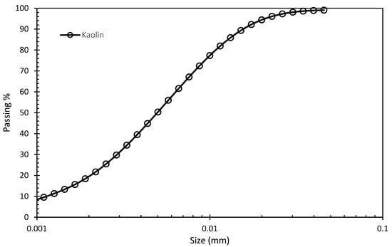 The kaolin clay (powder form, white color) is supplied by the company of BASF. The specific gravity (Gs) of kaolin clay is given as 2.58. The chemical composition of kaolin in Table 1 is given by the company. The liquid and plastic limit for kaolin is 74% and 32% []. The particle size distribution of kaolin shown in Figure 1 is based on the laser diffraction method.