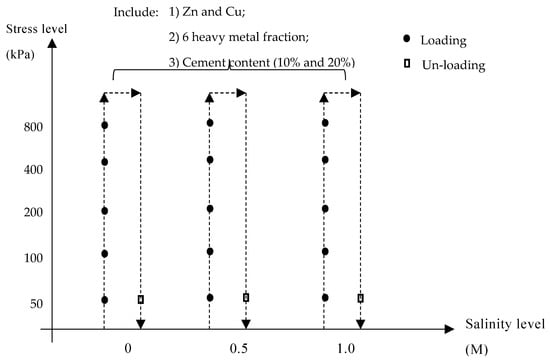 When the curing process was finished, the specimen in the oedometer was carefully setup. The corresponding salinity level was then poured into the chamber to provide a consistent salinity environment (i.e., 0M, 0.5M, and 1M). The compressibility test was conducted based on the conventional consolidation test [,]. Each loading cycle was terminated by the stabilization of vertical settlement after 24 h. When the whole loading test was finished, the un-loading behavior was also performed to assess the reversibility. The detailed process is demonstrated in Figure 2. The testing environment was controlled at 20 °C ± 1 °C.