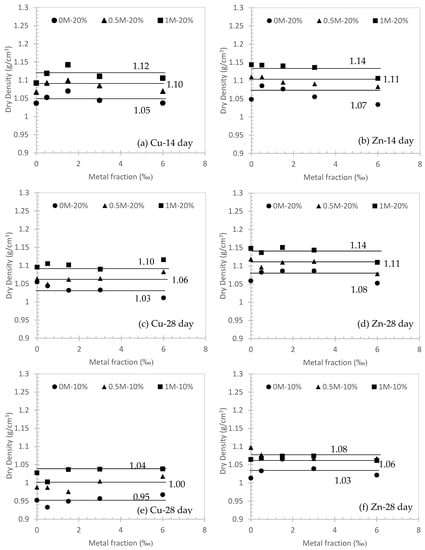 Figure 3 demonstrates the variations of dry density after curing in different conditions. It can be seen that the average dry density keeps a horizontal line as the metal fraction increases. This indicates the higher metal fraction in this study has a negligible effect on the dry density. Overall, the average dry density moves upwards at higher concentrations of NaCl solution for both Cu and Zn contaminated soils. At different curing days (i.e., 14 and 28 days), the average dry density for Cu decreases from 1.12 to 1.10 at 1M NaCl solution, 1.10 to 1.06 in 0.5M NaCl solution and 1.05 to 1.03 in 0M NaCl solution (Figure 3a,c). However, at the same condition and curing day, the average dry density remains the same for Zn, which is 1.14 at 1M NaCl solution, 1.11 at 0.5M NaCl solution, and 1.07~1.08 at 0M NaCl solution (Figure 3b,d). Moreover, the average dry density of Zn contaminated soils is slightly higher than Cu-contaminated soils. The comparisons were also made for different cement content for Cu (Figure 3c,e) and Zn (Figure 3d,f). In general, the 20% cement content is about 0.05 to 0.06 higher than 10% cement content in 0M, 0.5M and 1M of NaCl solution.