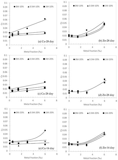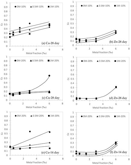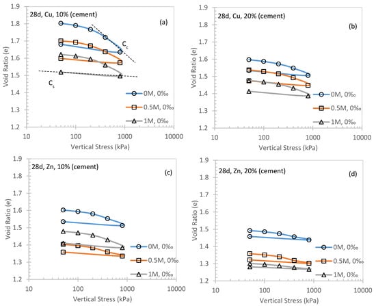 It can be observed from Figure 4, Figure 5 and Figure 6 that Cc is always larger than Cs, which is consistent with the elastoplastic theory for conventional soils [,]. In Figure 5a,c,e, a positive correlation between Cc and Cu fraction was observed. This suggests that the higher metal fraction in the contaminated soil will induce a stronger compressibility. Significant evidence can be found in Figure 5a (i.e., 28 days curing for 10% cement) and Figure 5e (14 days curing for 20% cement) in three different concentrations of NaCl solution. Additionally, the Cc of 0M Cu specimen is always higher than the 1M counterpart. This can be concluded that the higher concentration of NaCl solution will help to decrease the compressibility of cemented soils (e.g., Figure 5a). It can be also highlighted from Figure 5c that Cc can be compromised by a higher fraction (i.e., Cu at 6‰ in 0M NaCl solution) and decreased to Cc = 0.16 at 6‰ in 0.5M NaCl solution. Similar observations can be made for Zn contaminated soils (Figure 5b,d,f). However, for Figure 5d, the longer curing time (i.e., 28 days) of Zn is observed to have a similar performance to Cc regardless of the salinity levels.